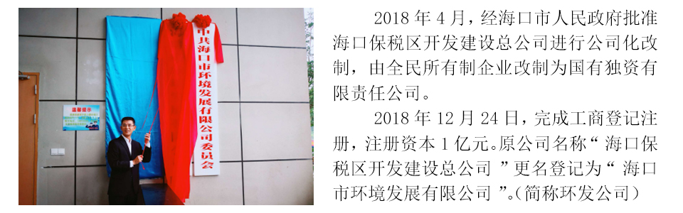 海口市環(huán)境發(fā)展有限公司是海口市屬國有獨資有限責任公司,于2018年12月正式掛牌運營,注冊資本1億元,由1993年12月成立的海口保稅區開發(fā)建設總公司進行公司化改制而成,核心業務為環(huán)境環(huán)衛(wèi)產業投資和運營、資產運營和管理,培育業務為工程管理